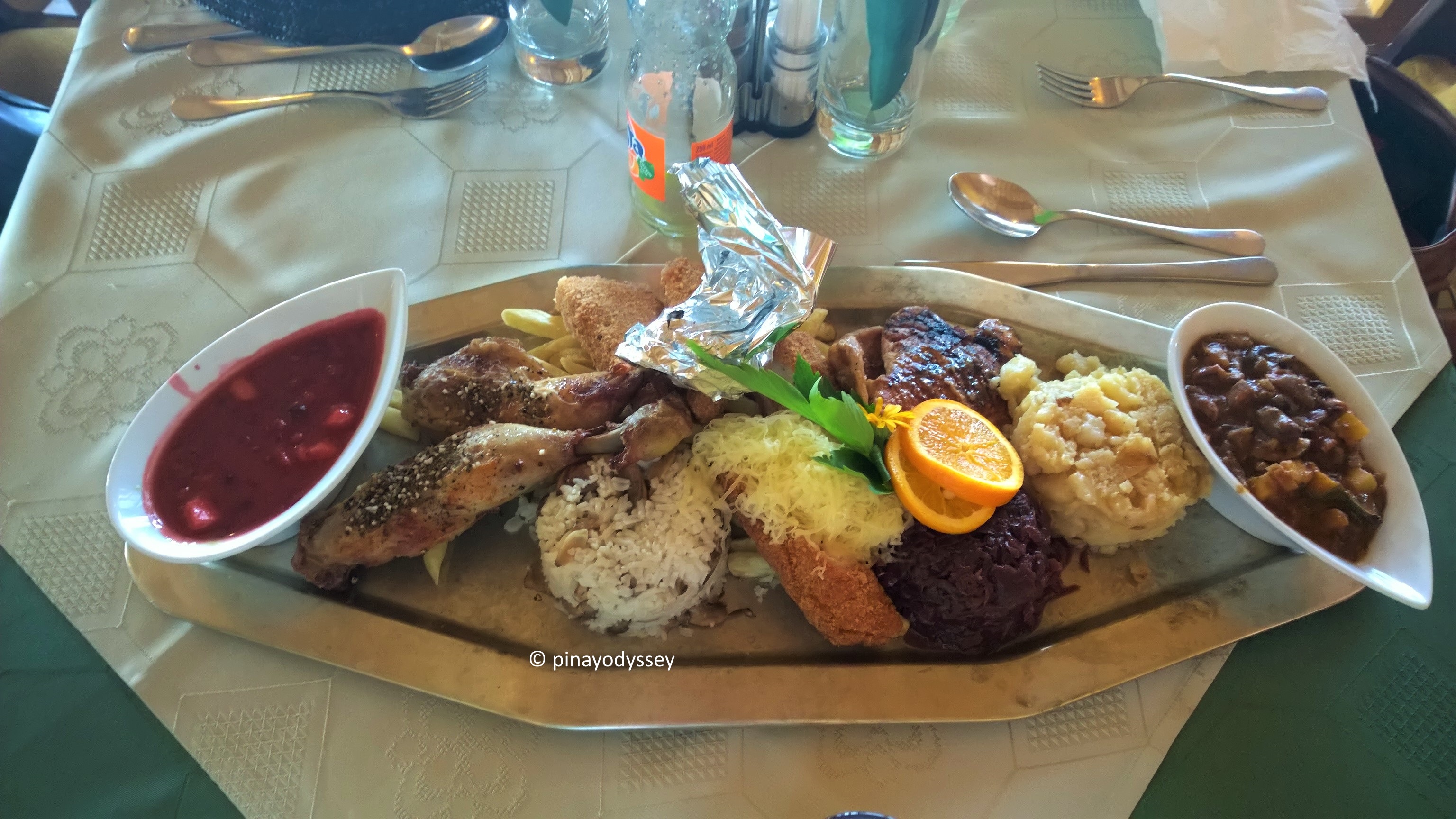 Upon reaching the top of the hill, or the entrance to the fortress, we were super exhausted that we decided to find a place to eat or get refreshments first! Apparently, not far from the citadel is a really nice restaurant called the Nagyvillam Etterem. For 6950 forint, or 200 NOK, (that’s 100 NOK each) we enjoyed a huge meal of chicken, potatoes, rice, etc. 😛 The restaurant also offers a great view of the river and mountains.