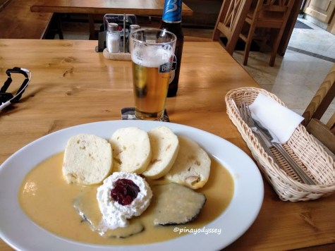 When in Prague, it is good to try some traditional Czech cuisine. For lunch, I had some traditional beef fillet with cream sauce and dumplings! Czech bread dumplings are locally known as houskový knedlík, and it’s super soft, although it has some stale bread cubes in it. The first time I went to Prague, I went to Kutna Hora and had lunch in a tavern restaurant called Dačický. There, I had my first bread dumplings. It was only one time, but for some reason, I craved for it two years later. I’d probably crave for it if I visit Czech Republic again!