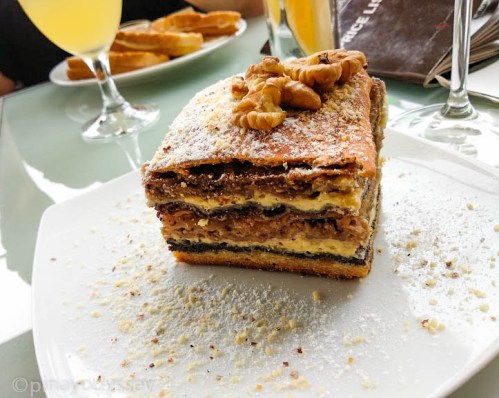 We had a pretty big breakfast so we were still full by lunch time. But with exhausted feet, we decided to go for a little coffee or juice break. There weren’t too many choices at the Castle: actually, there was only one. The Castle Coffee House. The restaurant next to it was under renovation. I’ve heard now that the coffee house is being renovated, and so there’s only the restaurant as the only choice. 😉 But rest assured that they serve quality meal! We enjoyed our fruit juices and a slice of the Slovenian gibanica or layer cake. Best served hot!