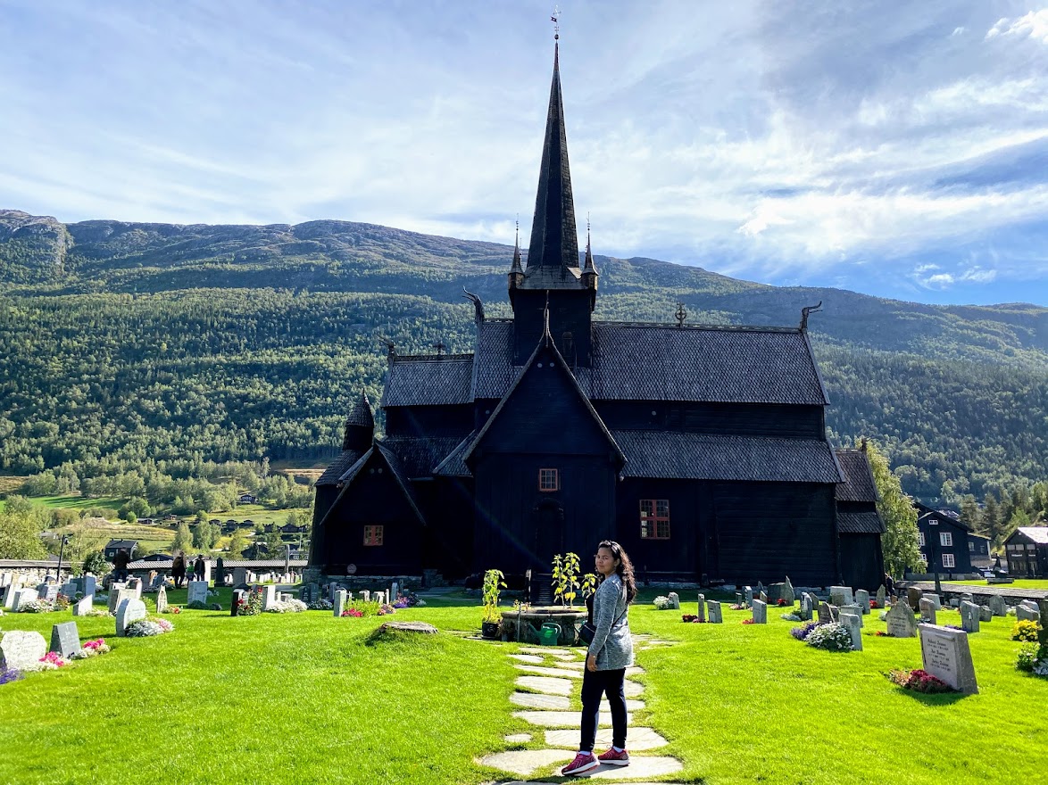 Lom stave church is a triple nave stave church, which is one of the oldest types of stave churches in Norway. Luckily, the church was still open for visitors when we came. It has a beautiful wooden brown facade in front and can seat up to 350 people. Interestingly, the back facade was black.