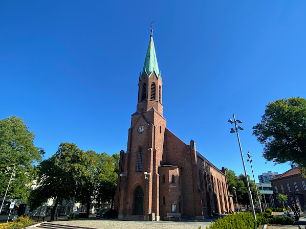 The church was facing a huge park and playground, and it was teeming with people on a hot September day. I was getting hungry by the time I left the church, but I wanted to find more caches before buying some late lunch. The next cache was a Norgesboks, a series of big box geocaches with a codelock. They are usually placed in big cities. In Moss, you’ll find one in this yellow building, which also shelters Kirkensbymisjon, a non-profit charitable institution in Norway.