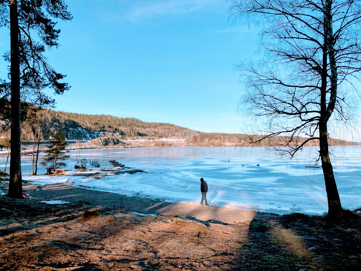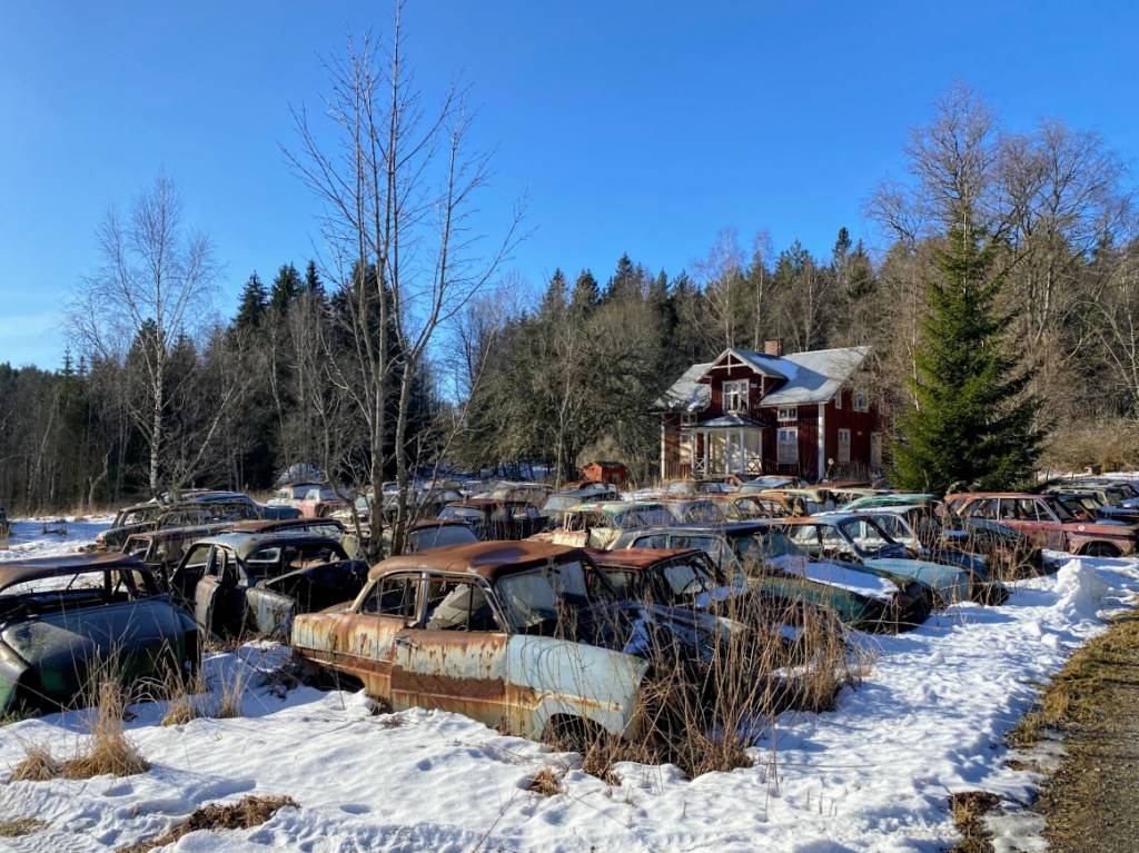 This roadtrip was done in February 2022, so the grounds are still covered in snow and the lakes – frozen! It was one of our mini weekend getaway. The plan was to stay in a herregård (manor house in Säffle, Sweden) for a night, and just visit a couple of sights on the way. I chose the Halden Canal in Ørje, one of the more popular border crossings between the two countries, and Carl chose the Båstnäs Car Cemetery in Årjäng. A car cemetery? Intriguing..