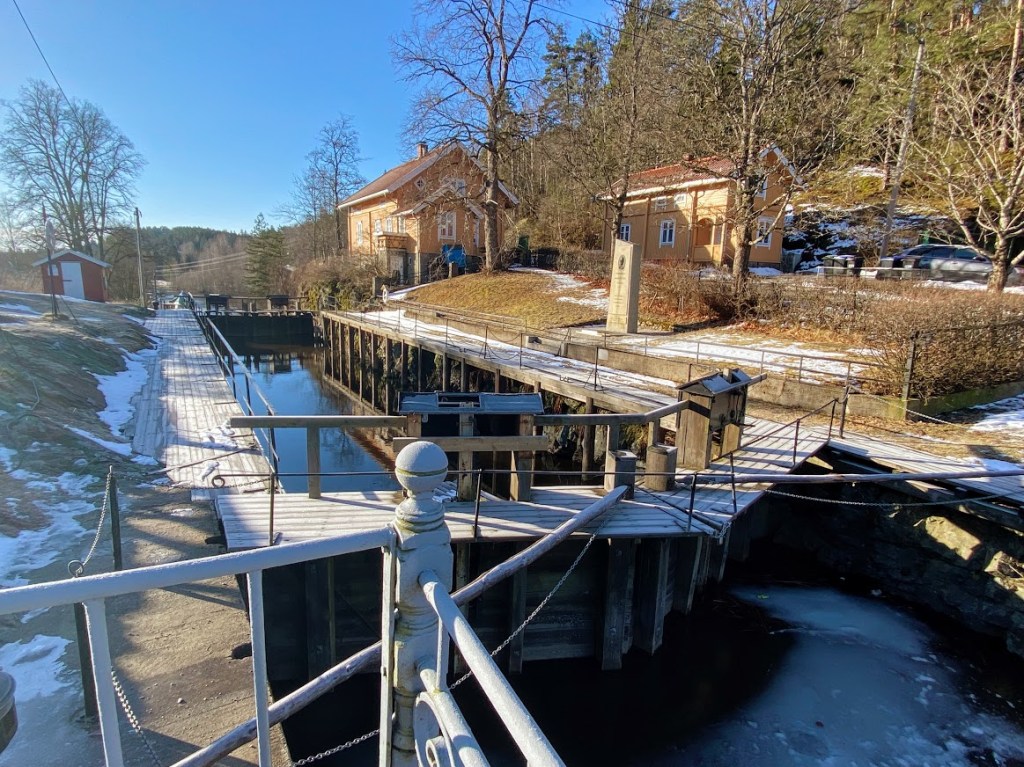 But the main attraction in Ørje is the lock belonging to the Halden Canal. There’s a museum for the canal, but as we arrived there quite early in the middle of winter, it was unfortunately closed. However, there were helpful information boards and brochures.