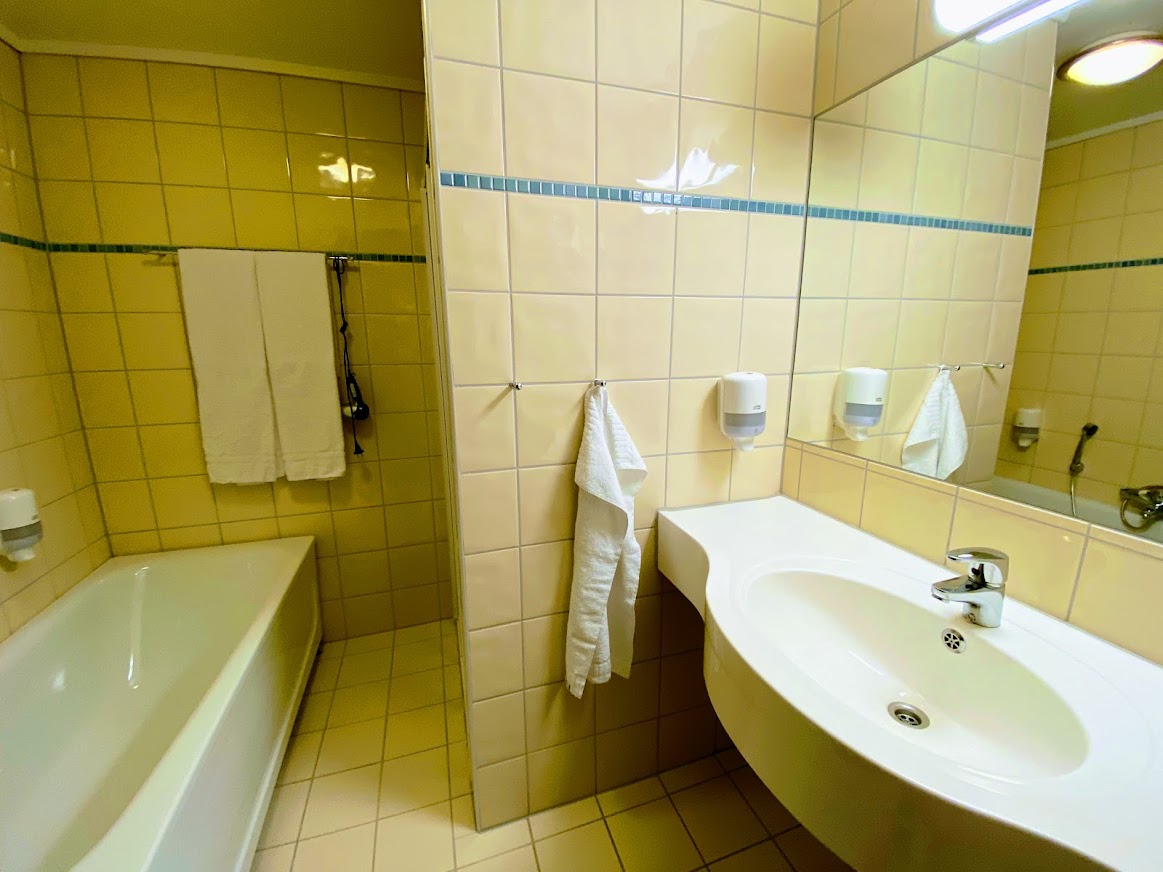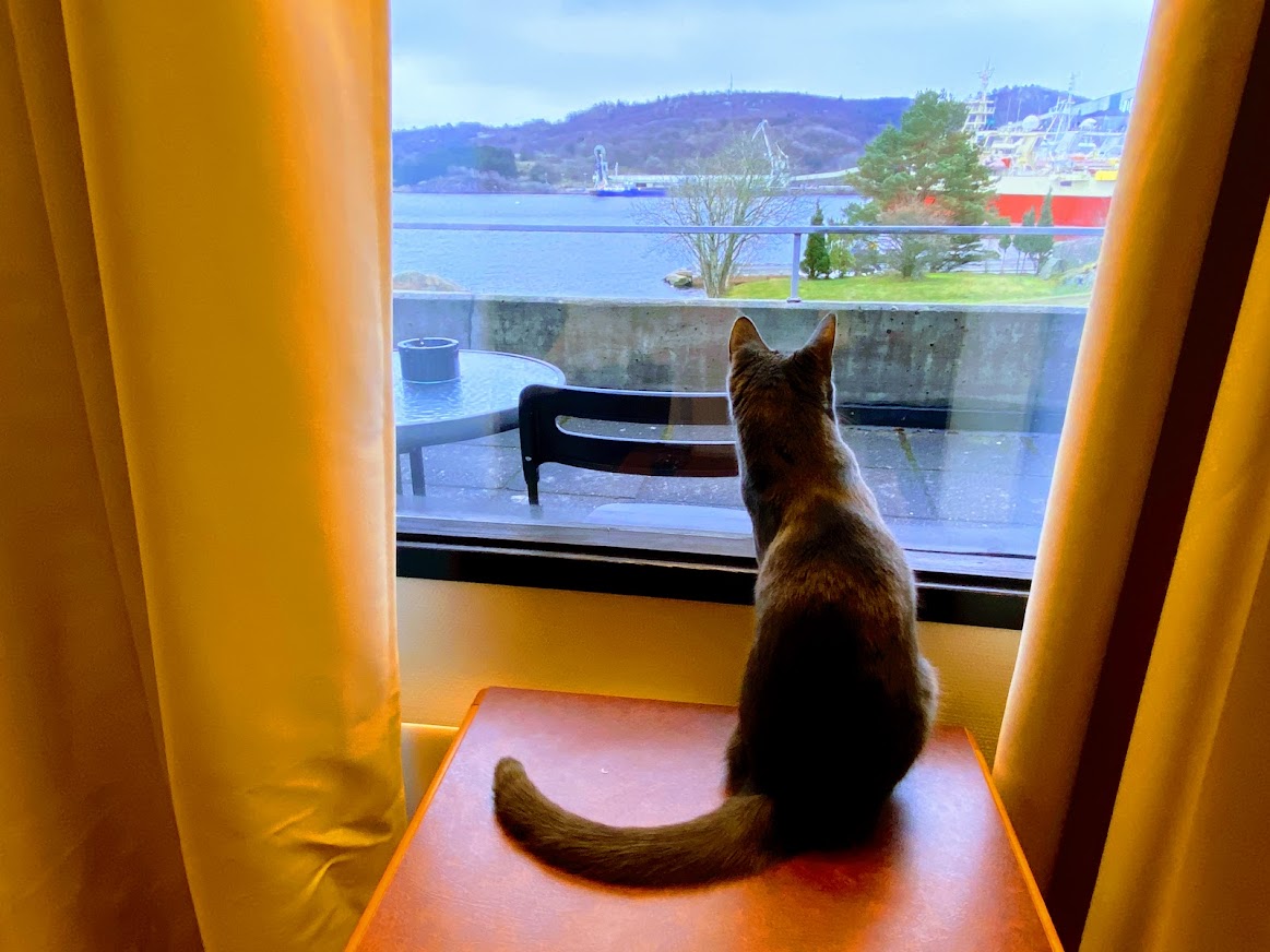 The trip south to Farsund took about 5 hours, thanks to roadworks. We left Wednesday afternoon and planned to stay until Friday noon. Thankfully, Missy was all quiet and peaceful. We thought that the trip to Borås had helped her get more used to roadtrips. We had a nice and very spacious room at Farsund Fjordhotel, with a good view and a balcony which we didn’t use, as it was still cold in April.