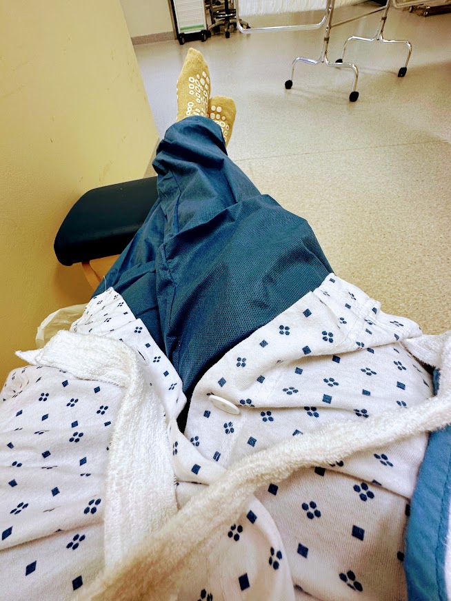It was painful to get out of bed, but I’ve learned techniques from my work, so it went fine. It was also painful to cough and laugh, so the nurse gave me the taped towel cube: to hug while I sneeze, cough, laugh. Then, I was moved to the bed post at around 11:30 am.