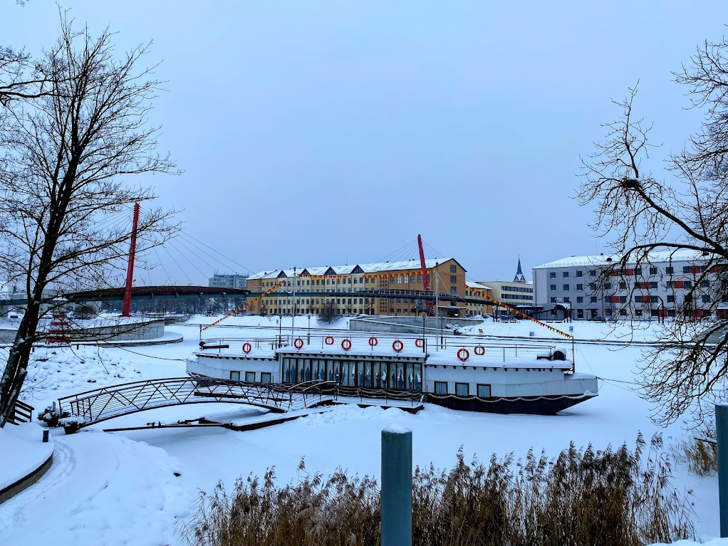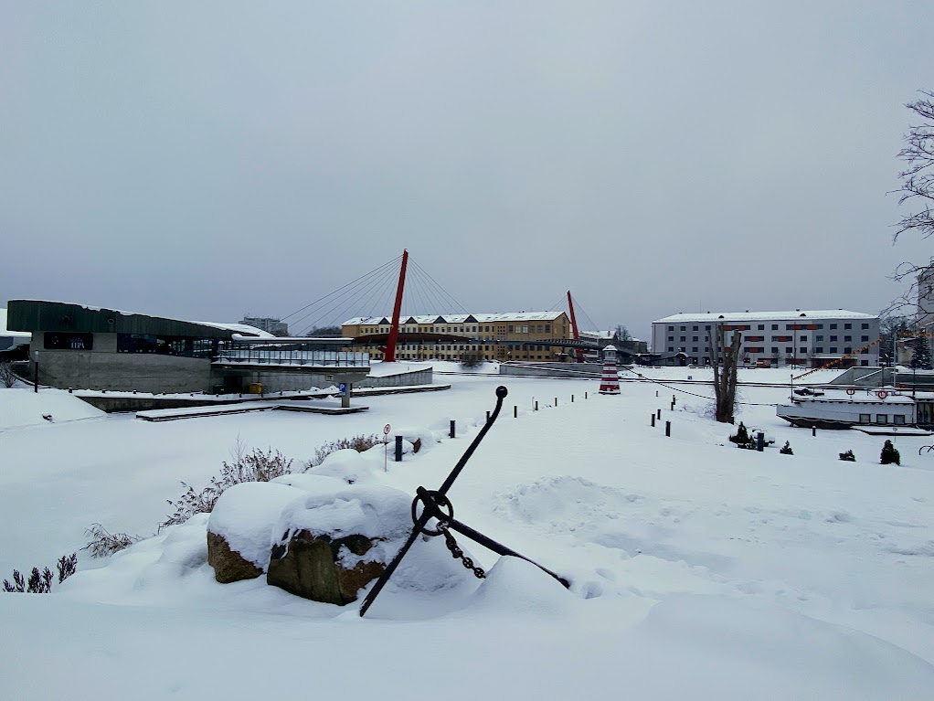 We reached Klaipeda at around 4 pm. We had the ship departing at 9pm, so we had plenty of time to explore the coastal city a bit. The place was covered by a meter of snow! It was fun to walk around, and the cranes looked like they were dancing.