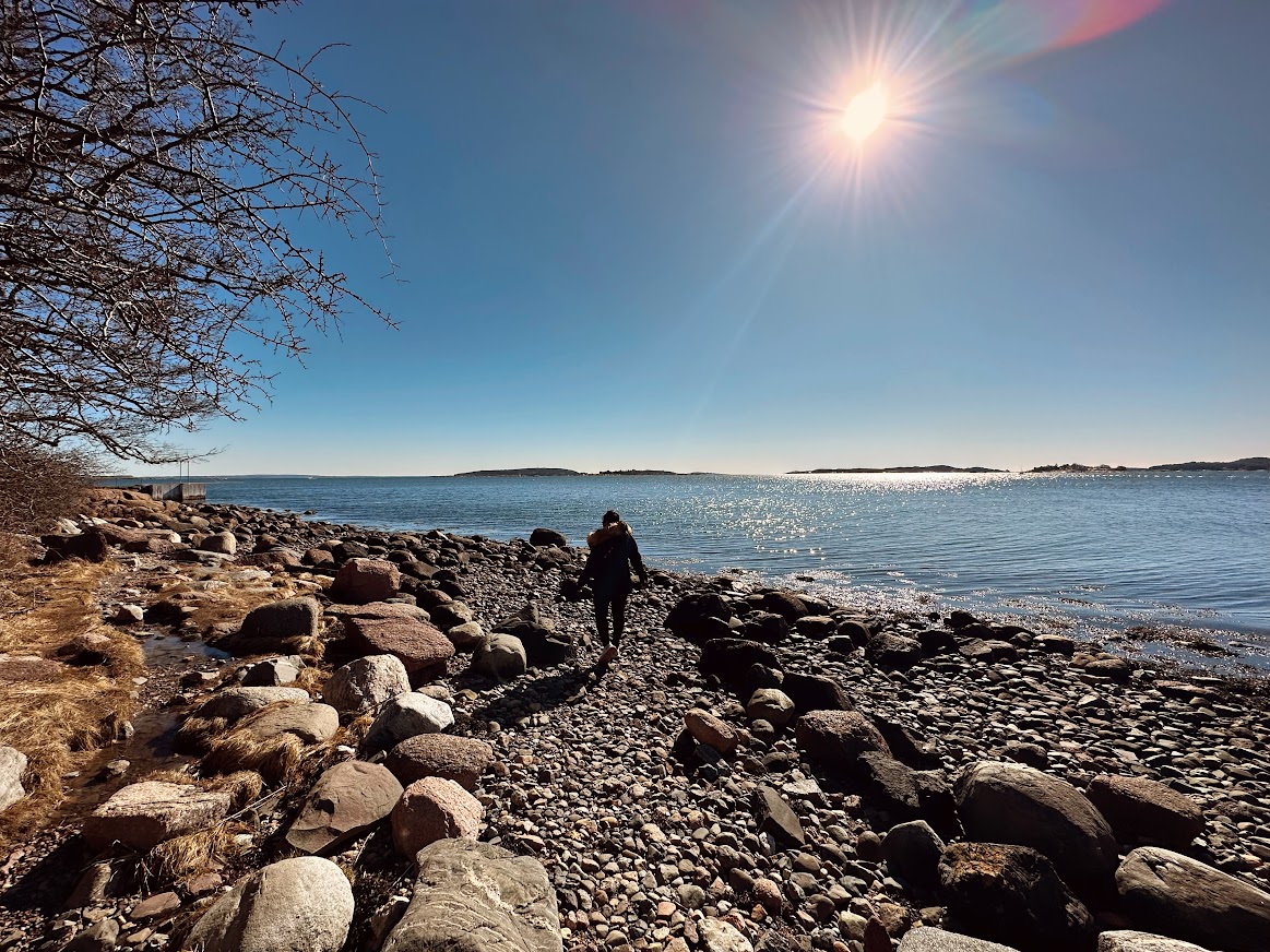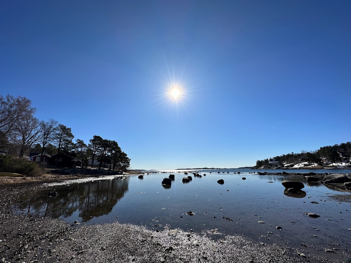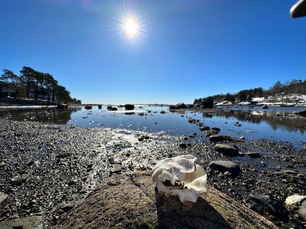 The place has a Geocaching trail, so I thought that it would be refreshing to take a walk there. It was still very cold, but the water was still and the sun was shining brightly. We followed the coastline and encountered sandy, pebbly, rocky, marshy, muddy, snowy and normal ground during the walk.