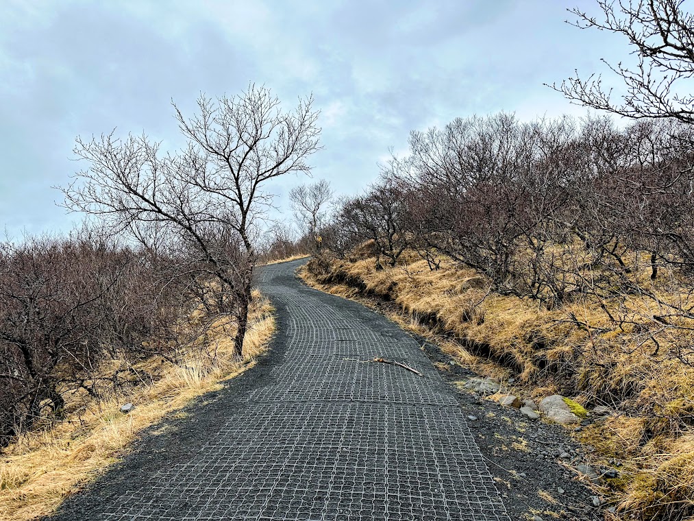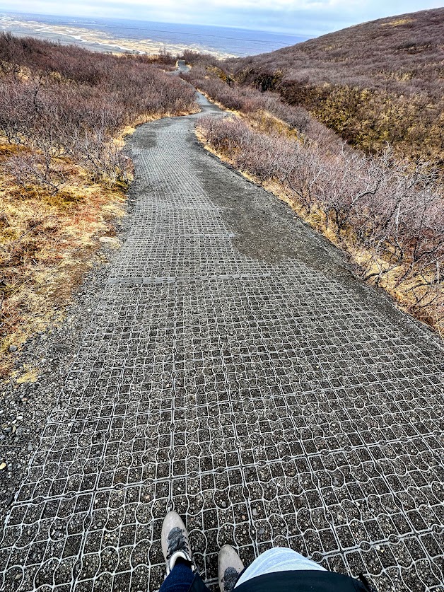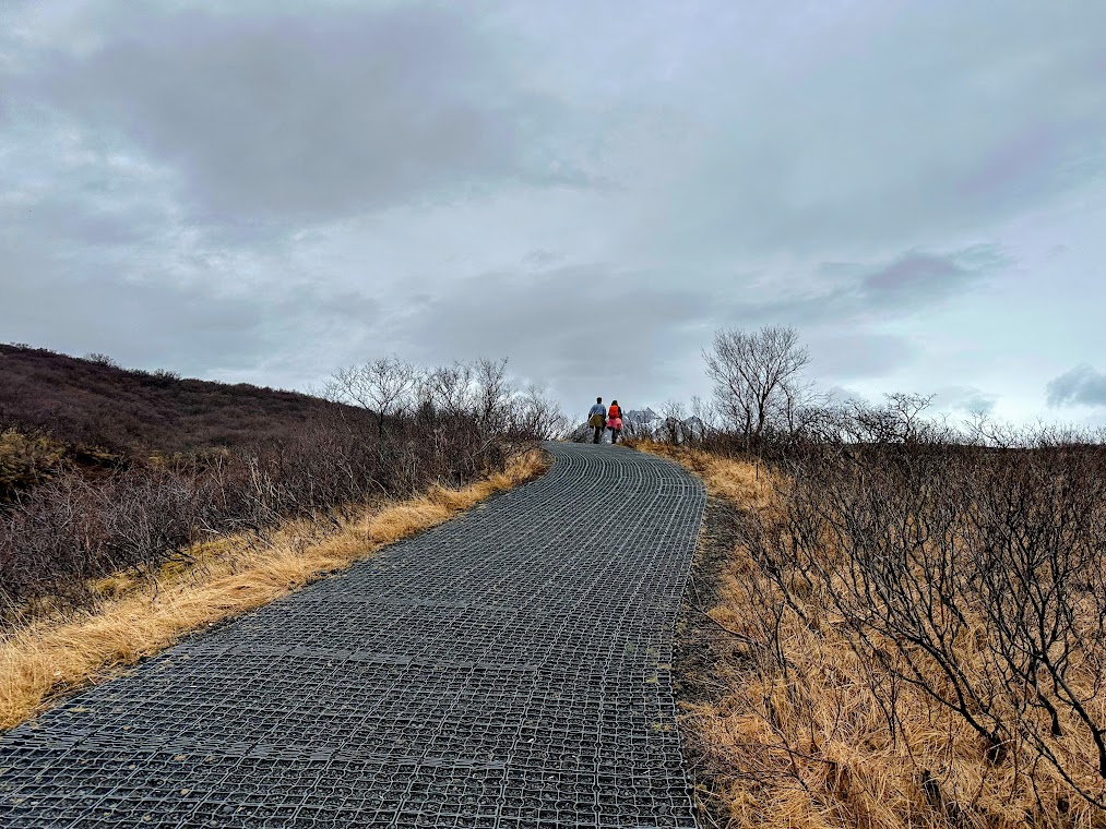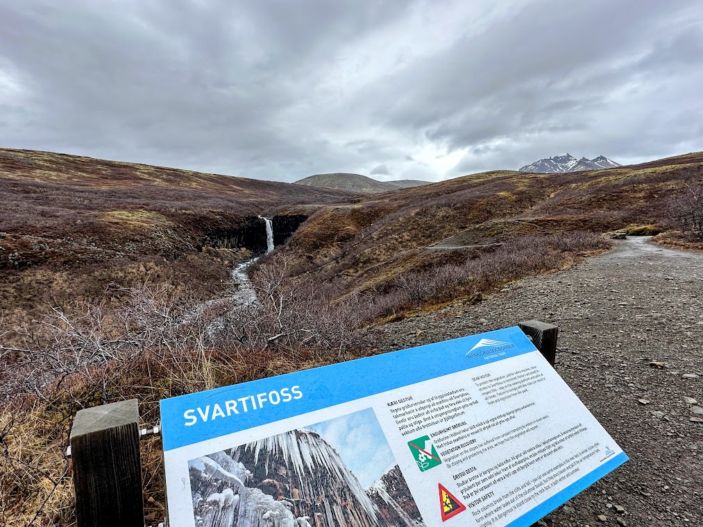 As mentioned, Svartifoss is a scenic waterfall located in Skaftafell national park. We parked next to a camping ground, then, started the 2 km hike. It says 2 kms on Google, but it felt longer due to the altitude! There are smaller waterfalls preceeding Svartifoss – the Magnúsarfoss, Hundafoss, and Þjófafoss. Before we reach Hundafoss, my husband did not feel well, so I decided to brave the hike on my own. Some parts of the path was covered in rubber net. There were moments when I wanted to turn back because the drizzle was annoying, but two female hikers sort of inspired me to continue.