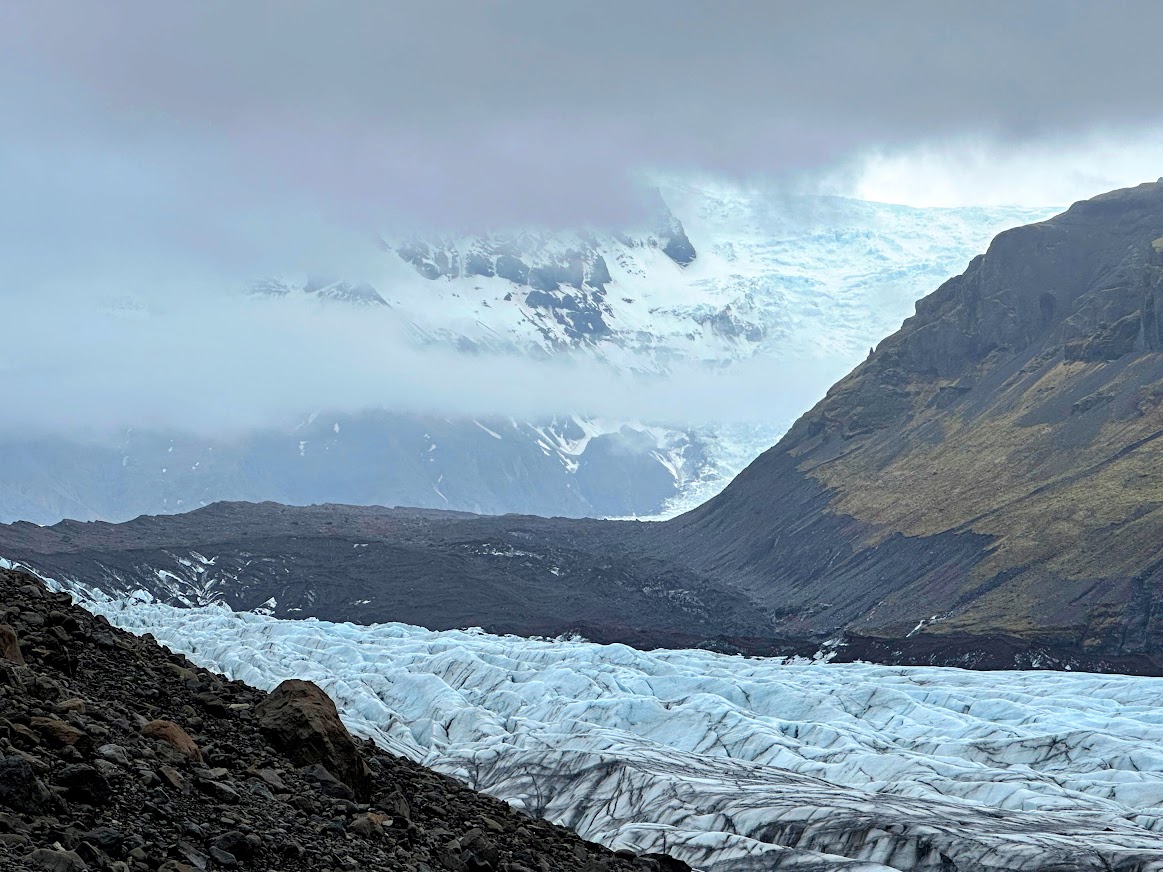 The glaciers were separated by a little mountain, and the Skaftafellsjökull’s tongue was wider than Svinefellsjökull’s. We checked out the nearest glacier, of course. At the foot of it was a deep green lake, and a cairn with a signpost for glacier monitoring. The tip of the glacier was mixed with lava sand, and the texture was rough and seemed unstable. Farther on, however, it was pure and bright white! One could actually see the high valley where the glacier poured out from.