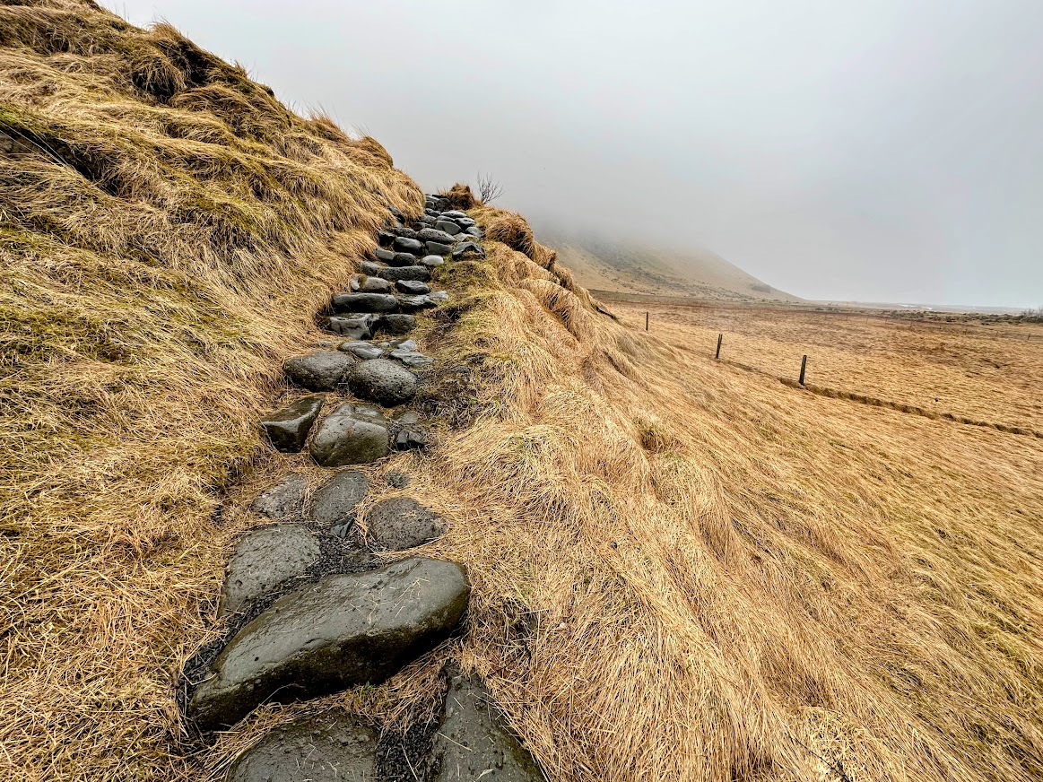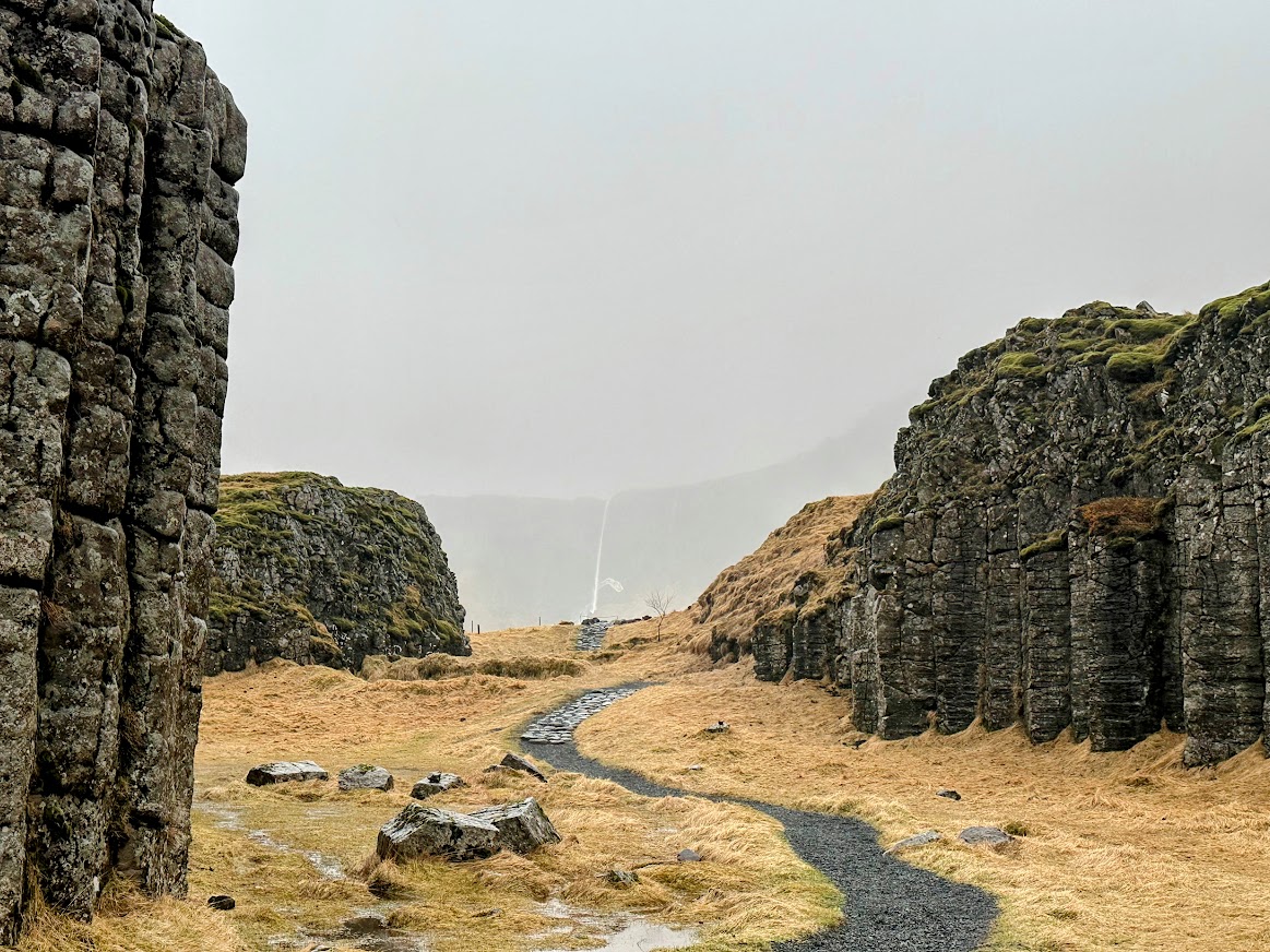 Our first stop was the Dverghamrar rock formations, aka the Dwarf cliffs. They’re perfectly formed hexagonal basalt columns created by hot lava rapidly cooling down. The narrow and high Foss á Síðu (waterfall) was visible from the Dverghamrar. We had a very quick stop, going around the hill. It was raining and the stone path was a bit slippery. But we managed to see the highlights, I guess. The question is, are there dwarfs in Dverghamrar?