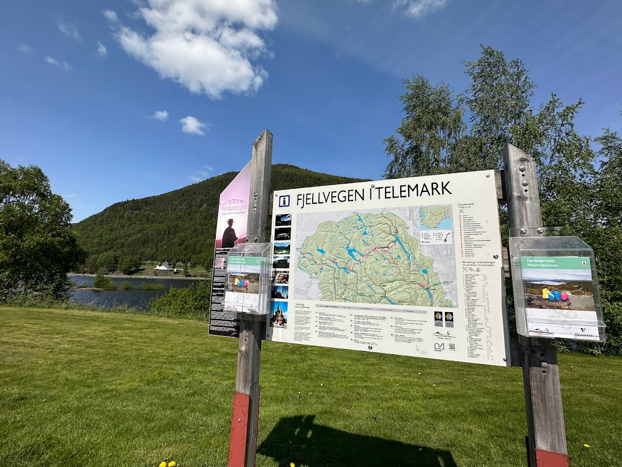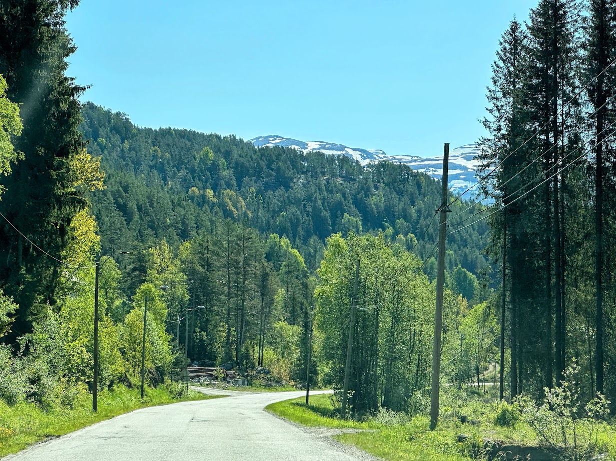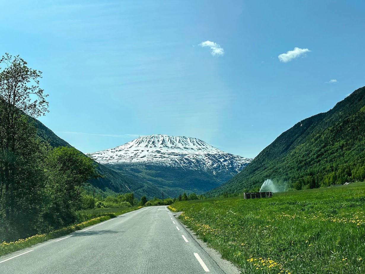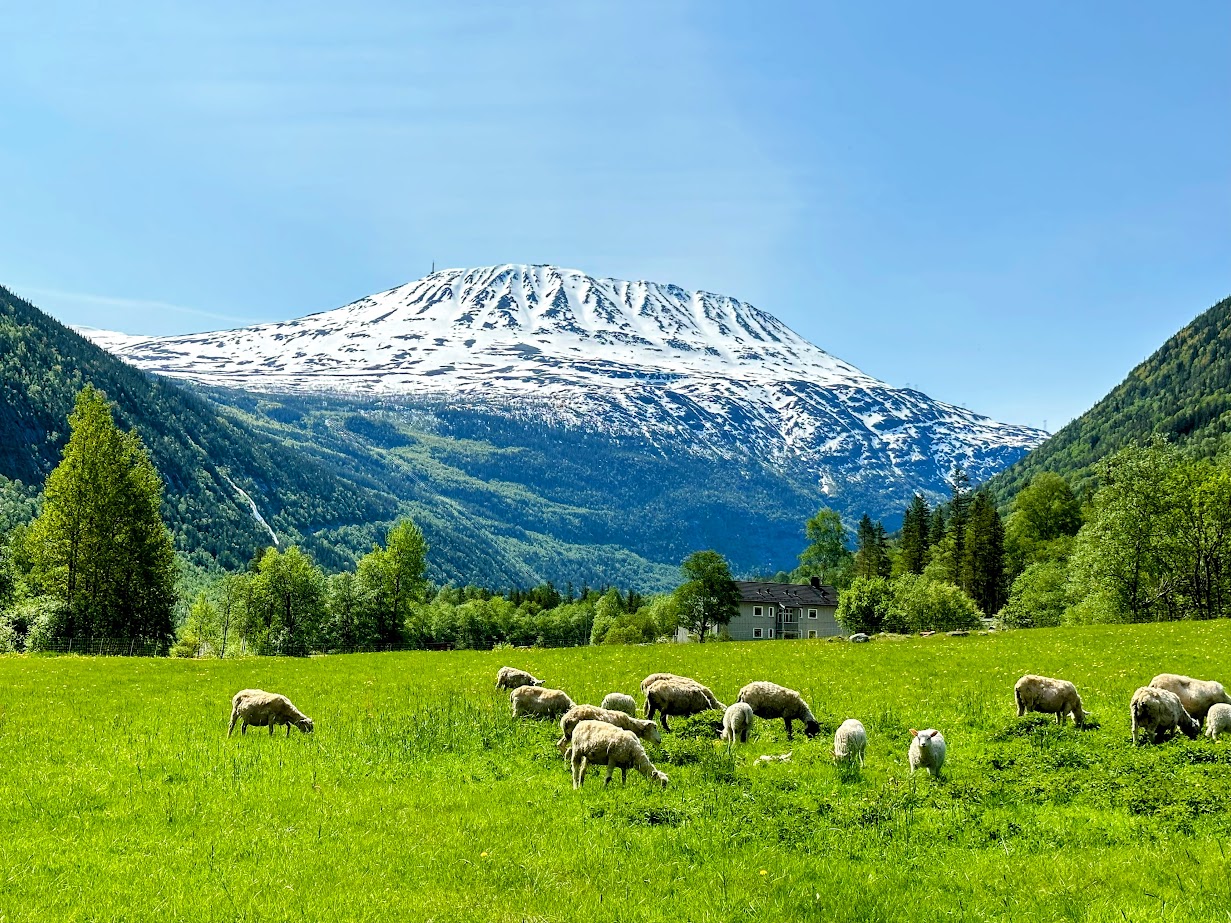 Driving on, we found ourselves on a lovely road surrounded by green fields and mountains, with herds of sheep and other farmy animals grazing. And a glimpse of the snow-capped Gaustatoppen, the highest mountain in the Vestfold and Telemark region, with a height of 1883 meters. I first saw the mountain in 2016. I hope we can get to visit the top one day. 🙂