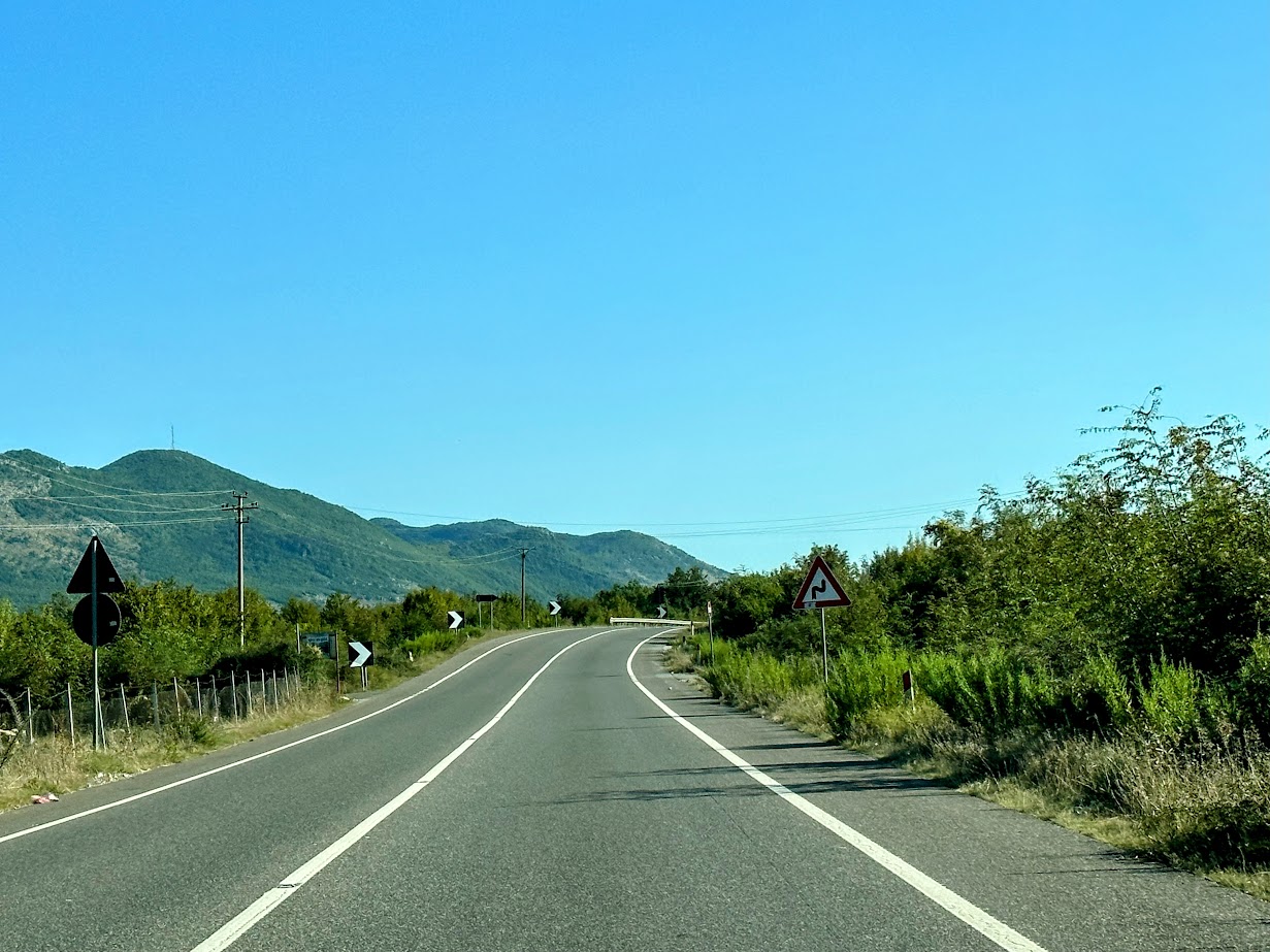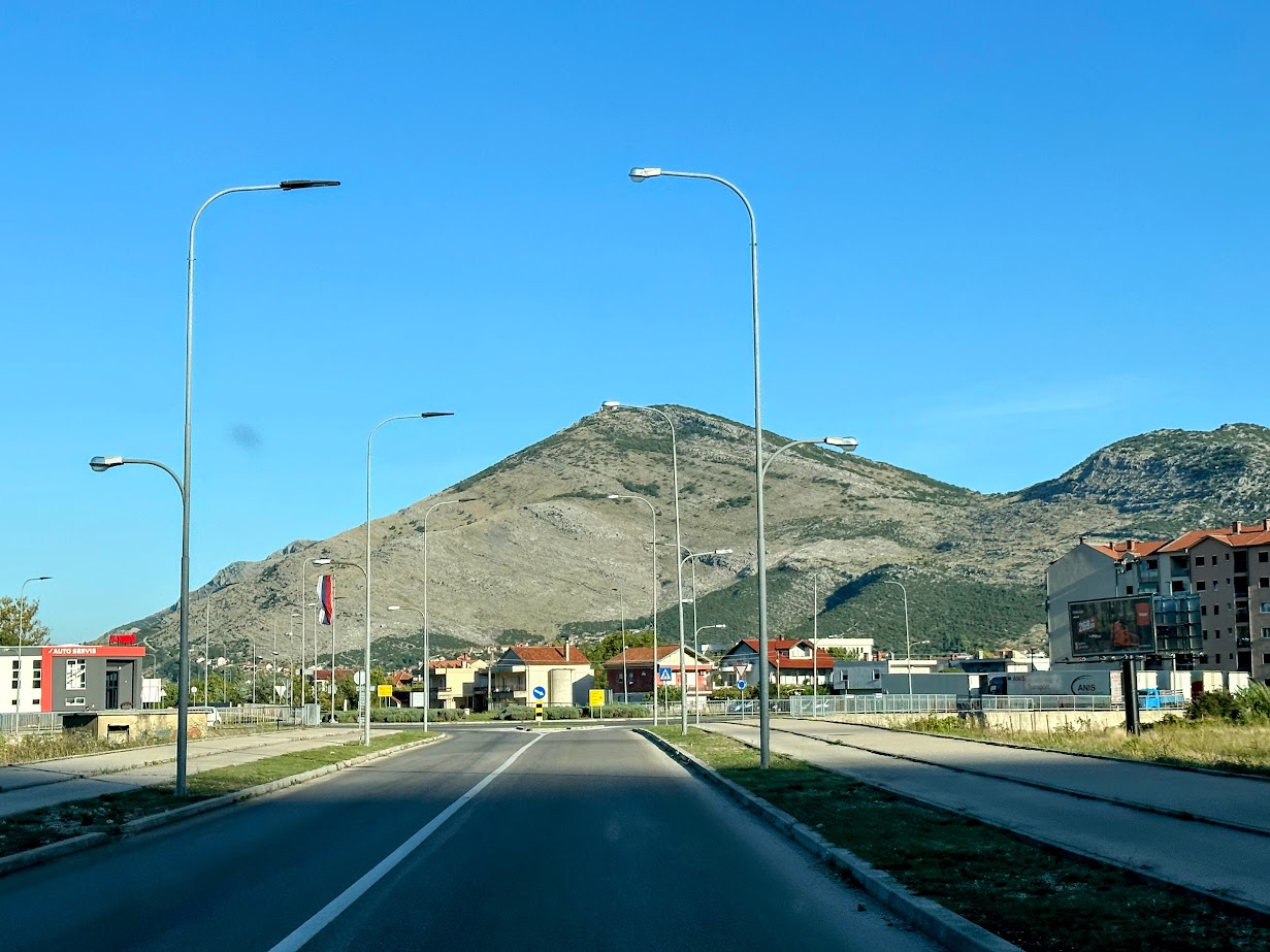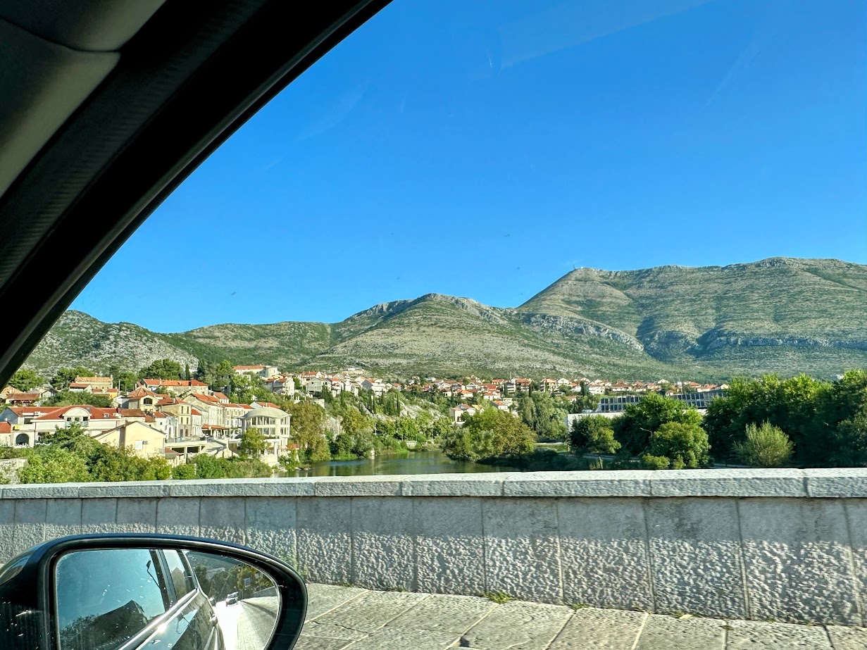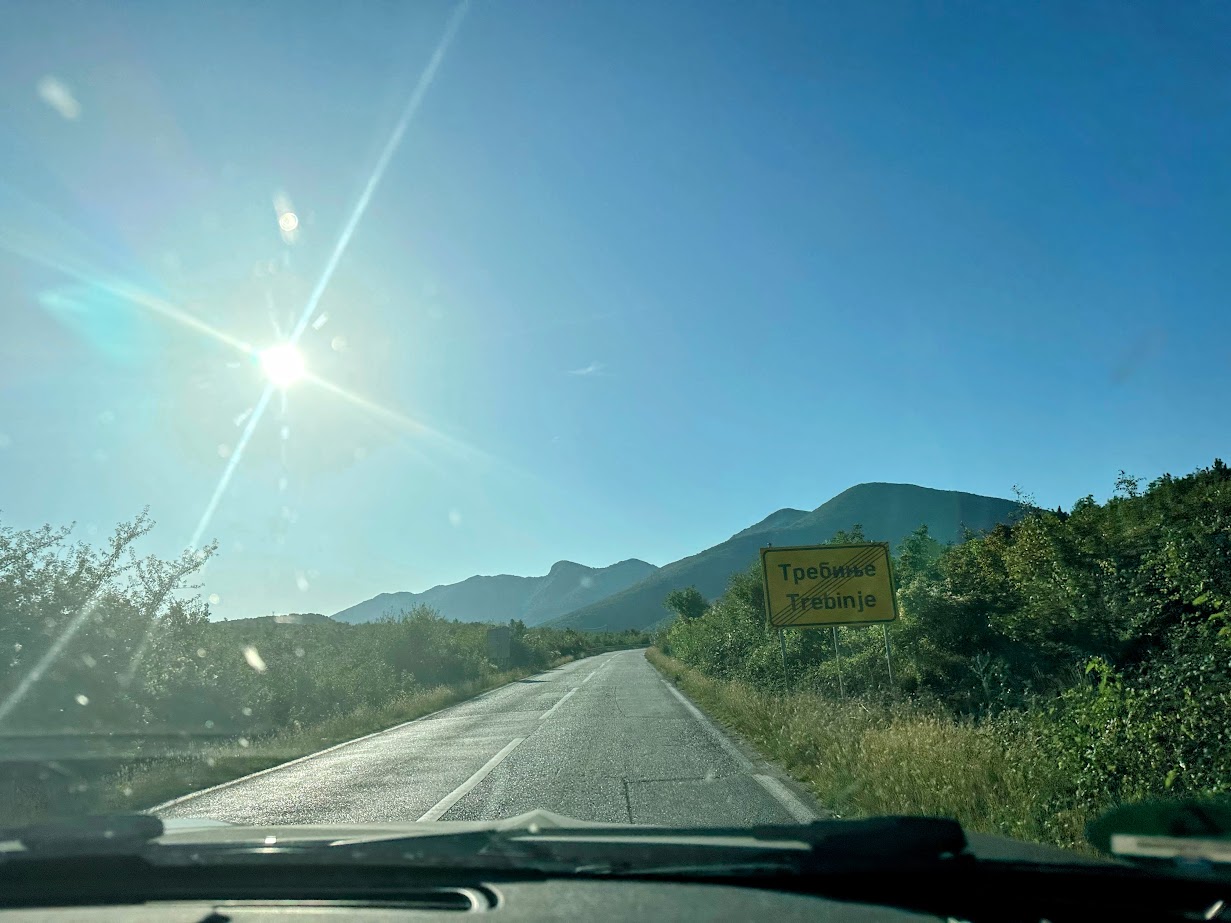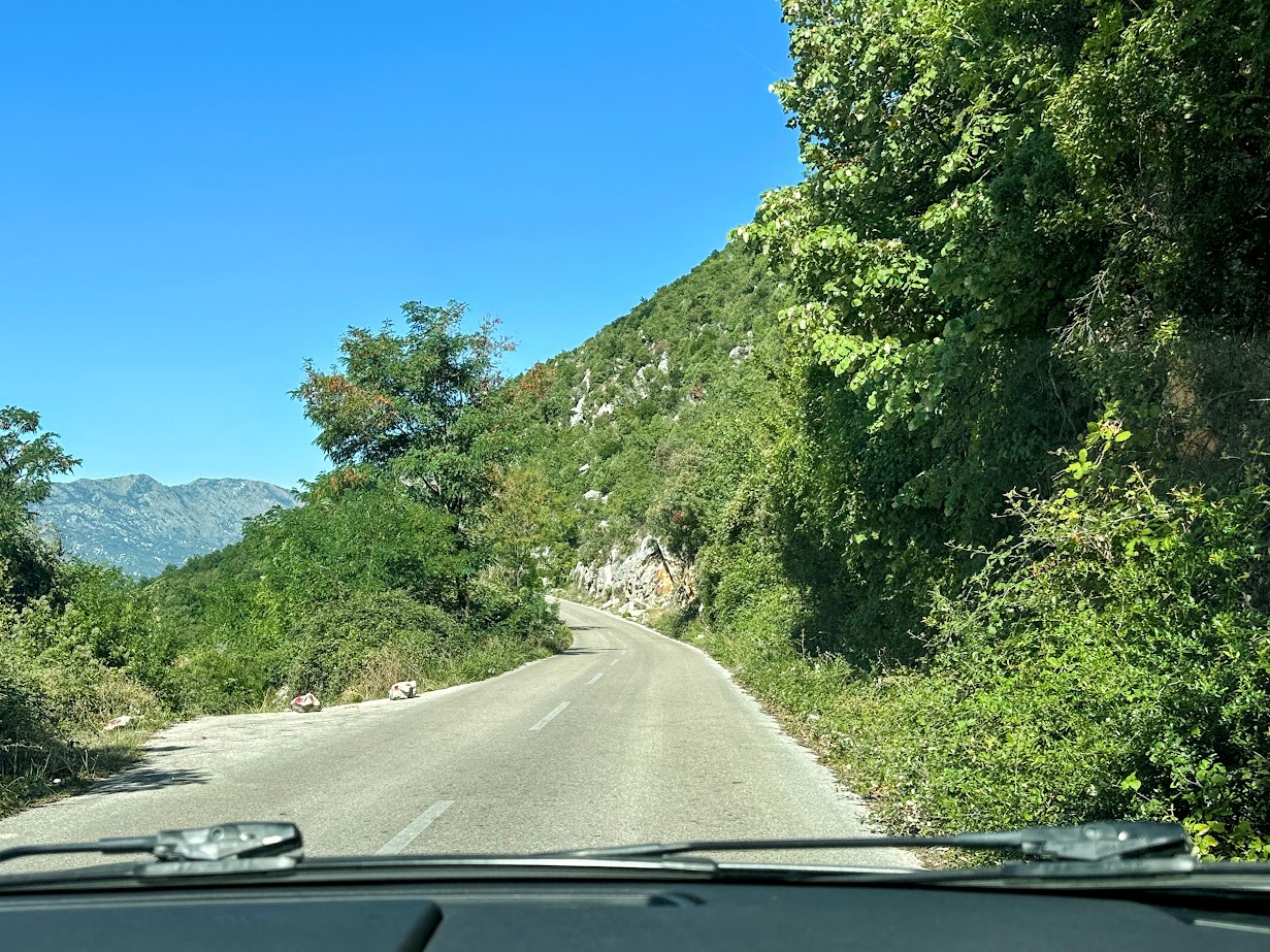 Luckily, we continued to be blessed with a clear and sunny weather. We left Trebinje at 7:30 am, hoping to escape the traffic (if there was any) at the border. I remember being worried because the border between Bosnia and Montenegro was up in the mountains – and there were photos of sole travelers online posing on a cliff. I told Carl that I didn’t want to stop by there – but him, being the curious and adventurous as he is, parked the car by the cliff and we took photos with the portruding rocks and vast mountains in the background. But before that, here’s the drive exiting Bosnia and Herzegovina: