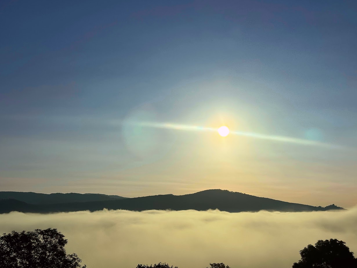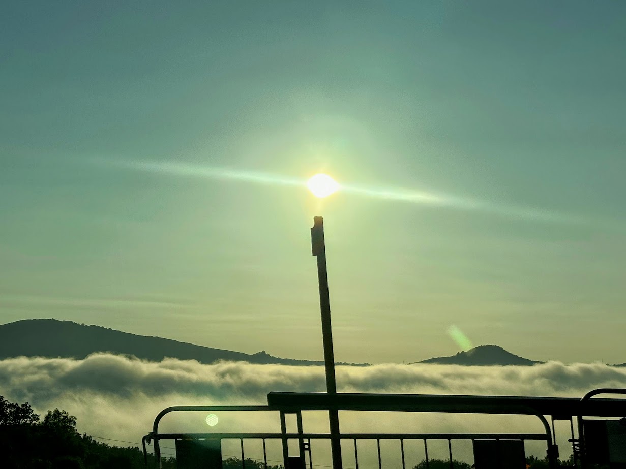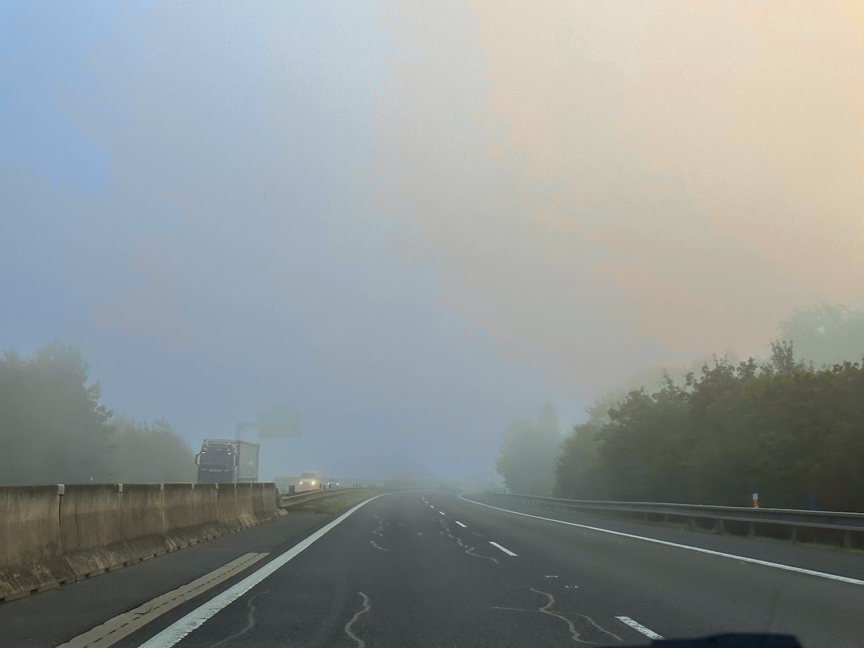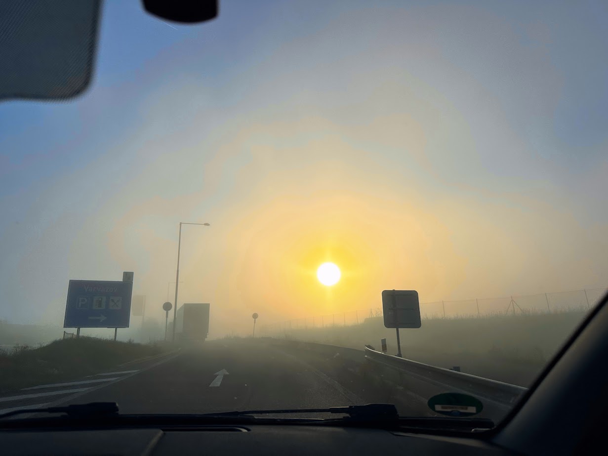 Approaching the border, we suddenly found ourselves in a foggy situation, literally. I don’t know if it had something to do with altitude, but whatever it was, it was beautiful. It looked and felt like a movie – a misty surrounding with the sun delicately creeping from behind the clouds. My husband drove carefully through it. We had the same experience in Iceland, but that took a longer and more creepy course.