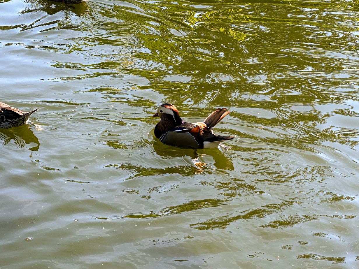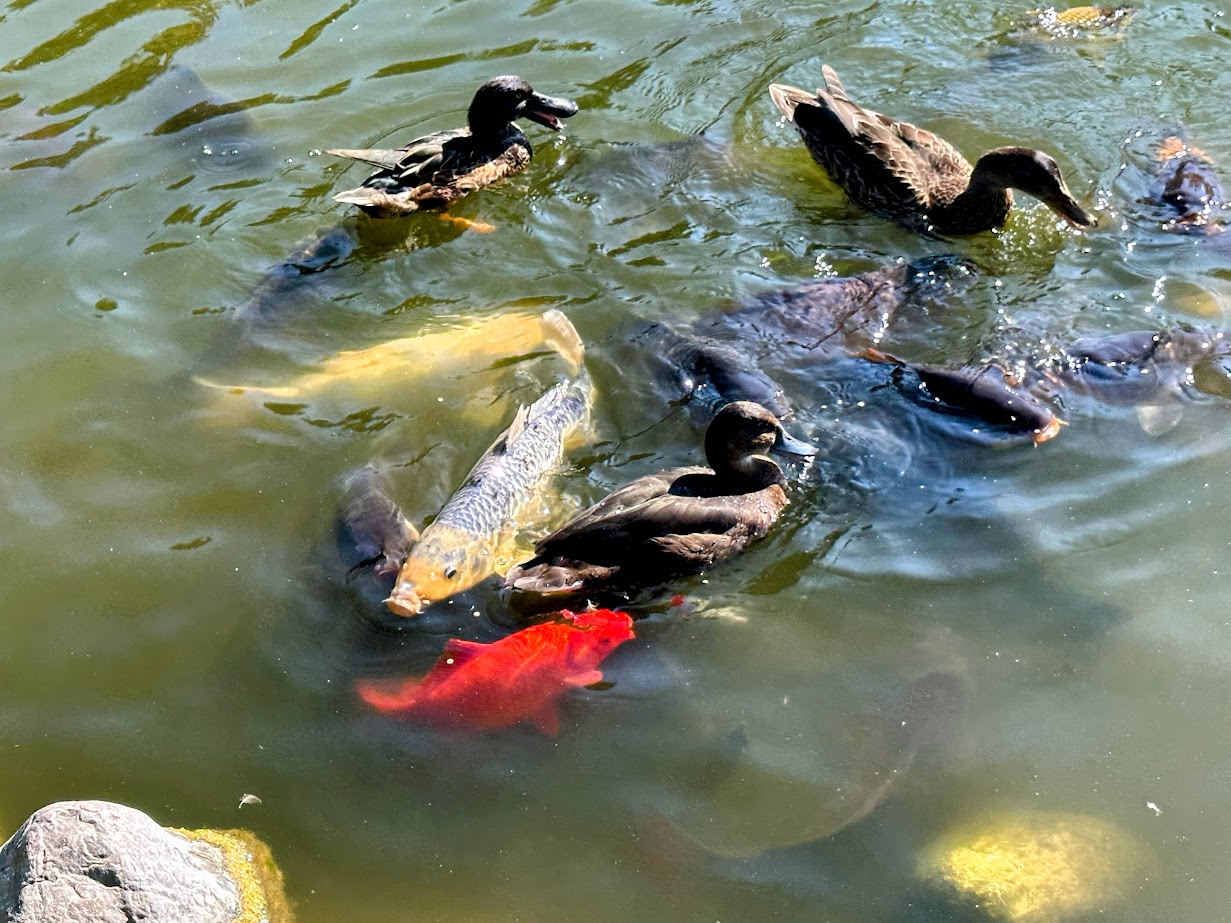 We bought some fish food, and watched as both ducks and fish fight for it. Then, we went to the goats to pet them.