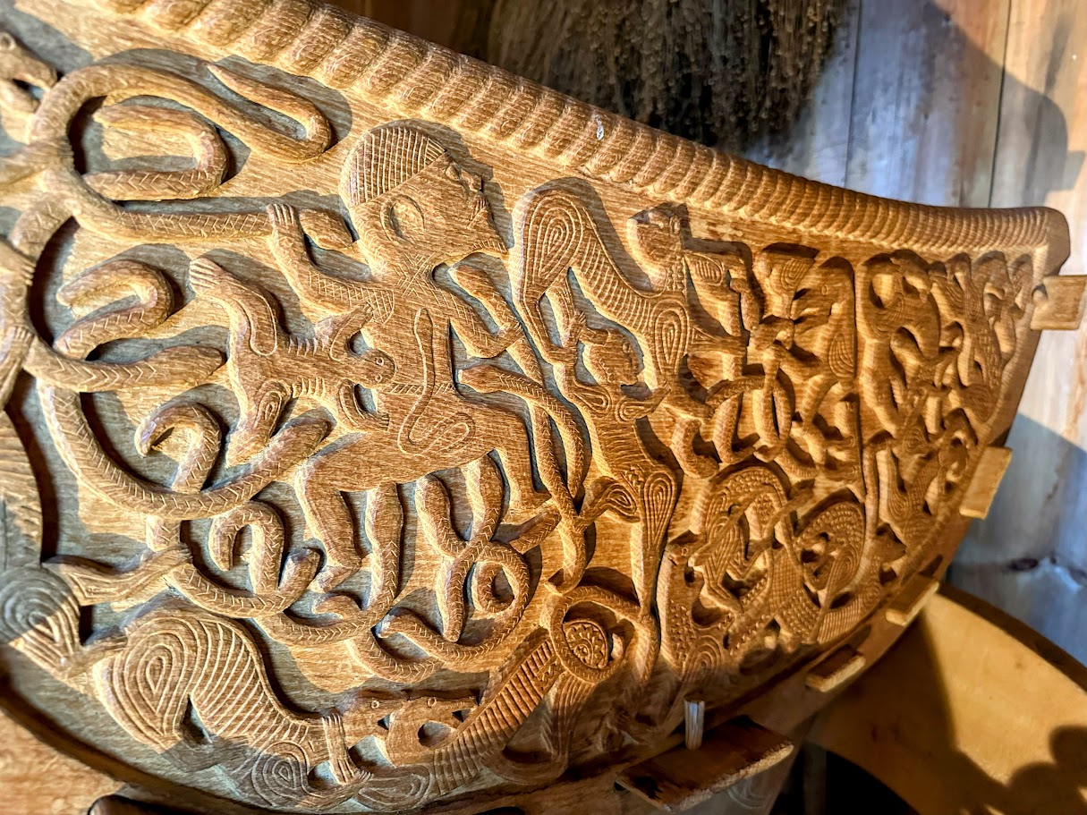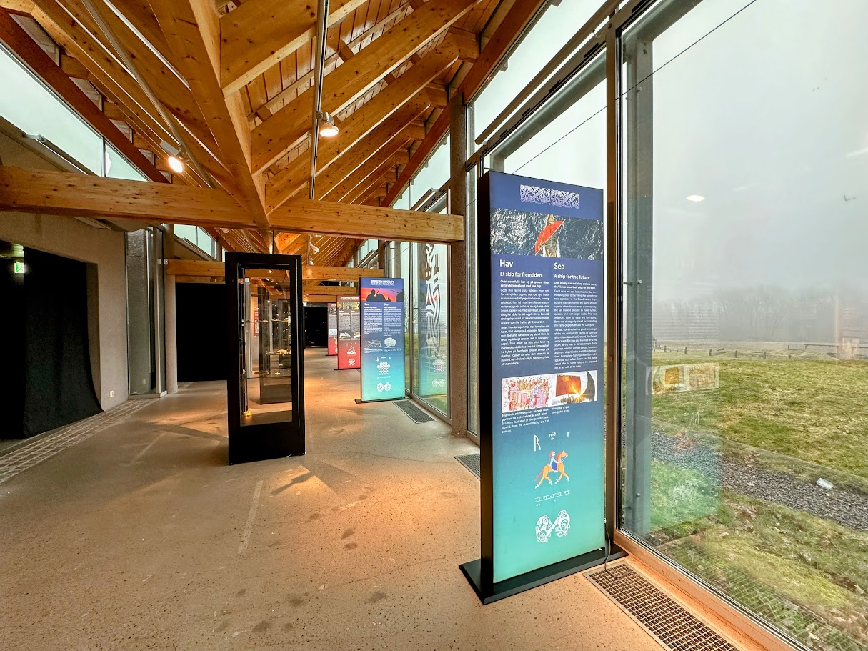 The main museum building was not very big. At 100kr per (adult) ticket, we got to see some displays of artefacts excavated from the mounds and read about the Viking Age and Norse mythology. There’s a museum shop (with no postcards!), and a cafe.
