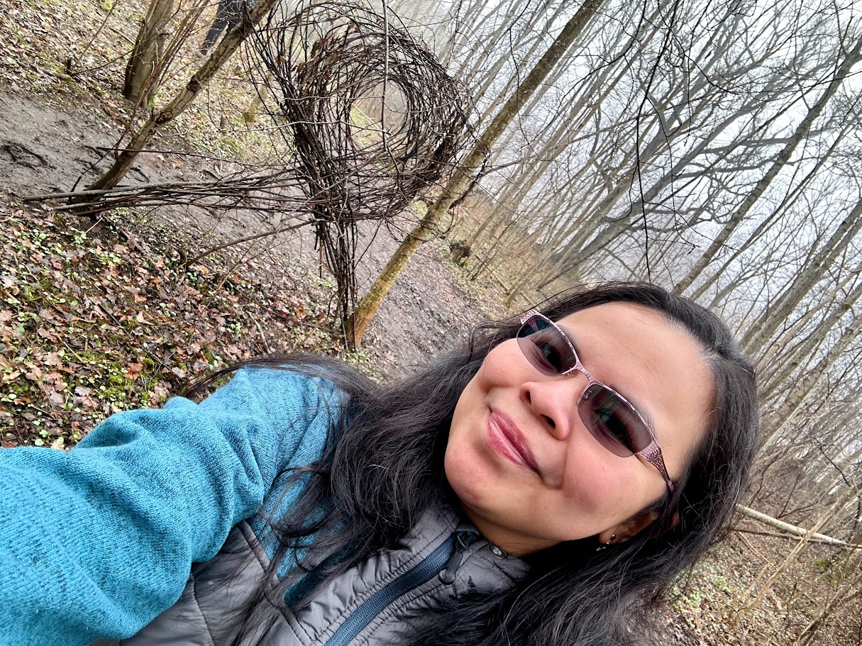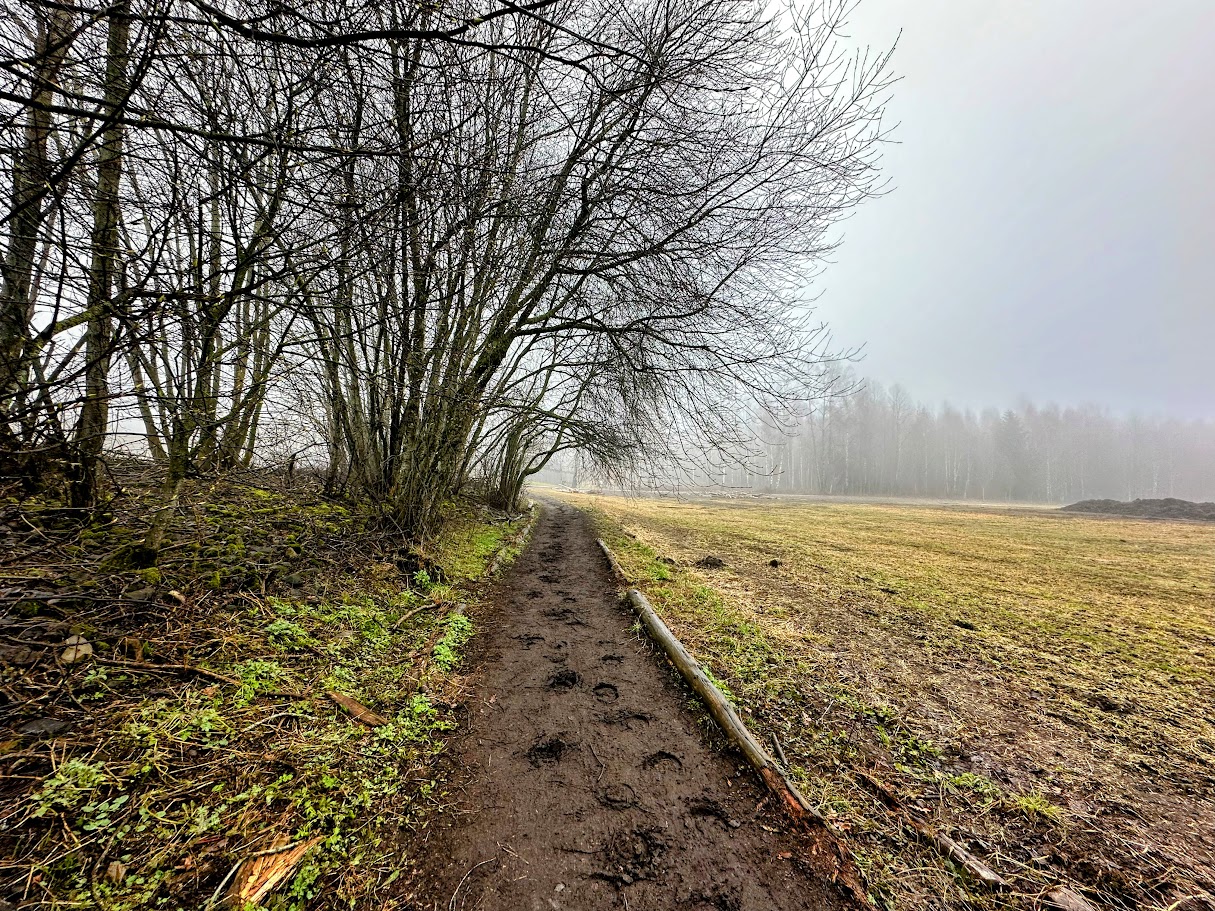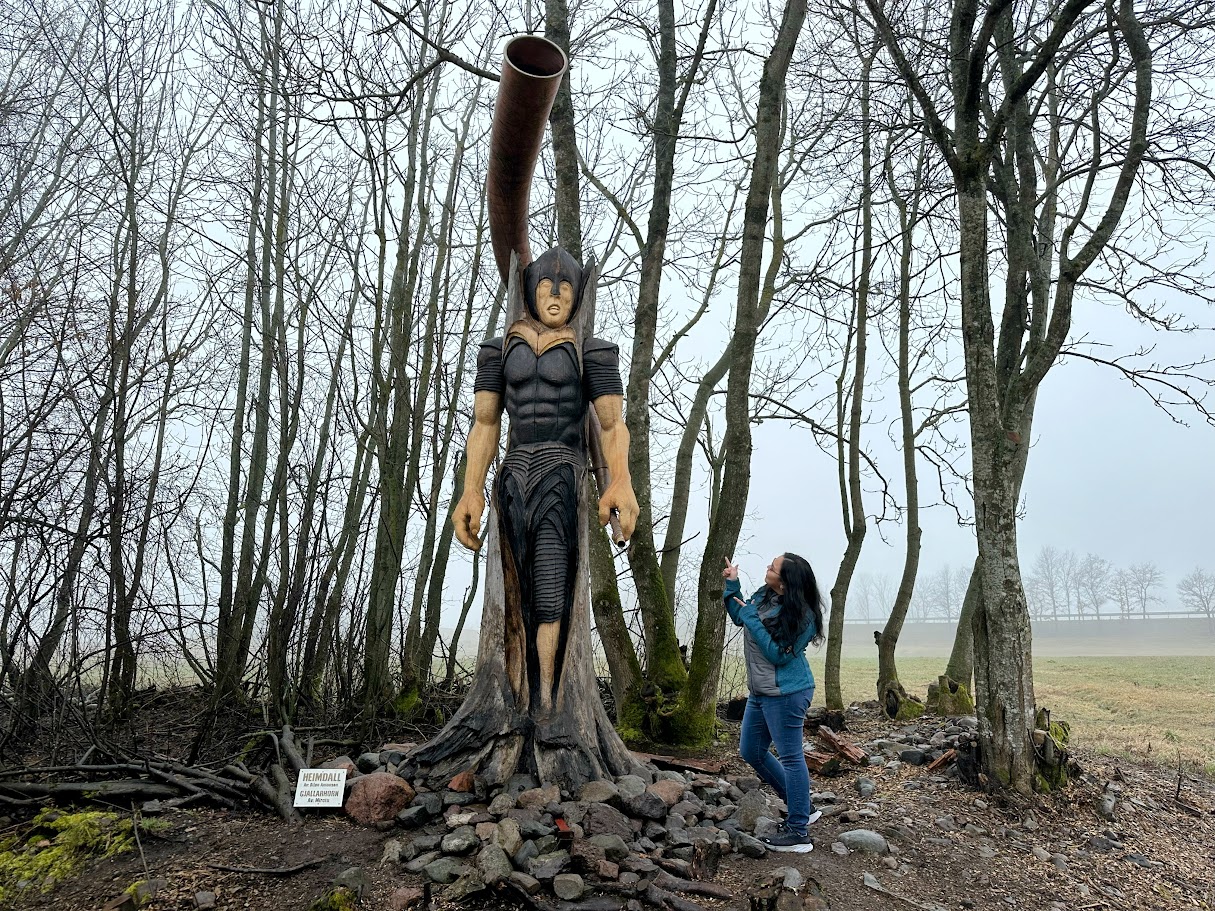 Then, through a little forest. The ground was muddy and covered in horse tracks. Then, we saw a wooden statue of Heimdall! In Norse mythology, he guards Bifrost, the rainbow bridge that leads to Åsgard, home to the Æsir gods. This visit is very timely. Carl & I just finished reading the Prose Edda by the Icelandic Snorri Sturluson (1179-1249).