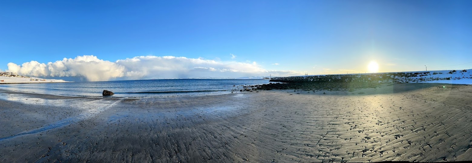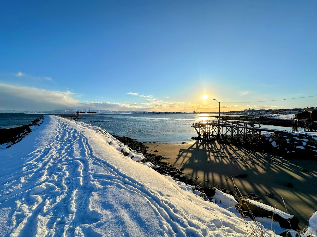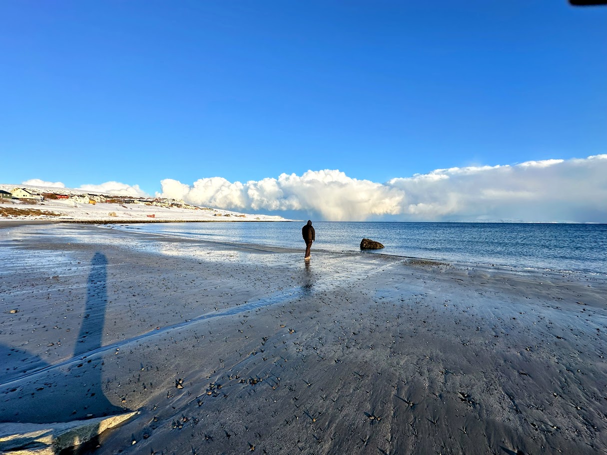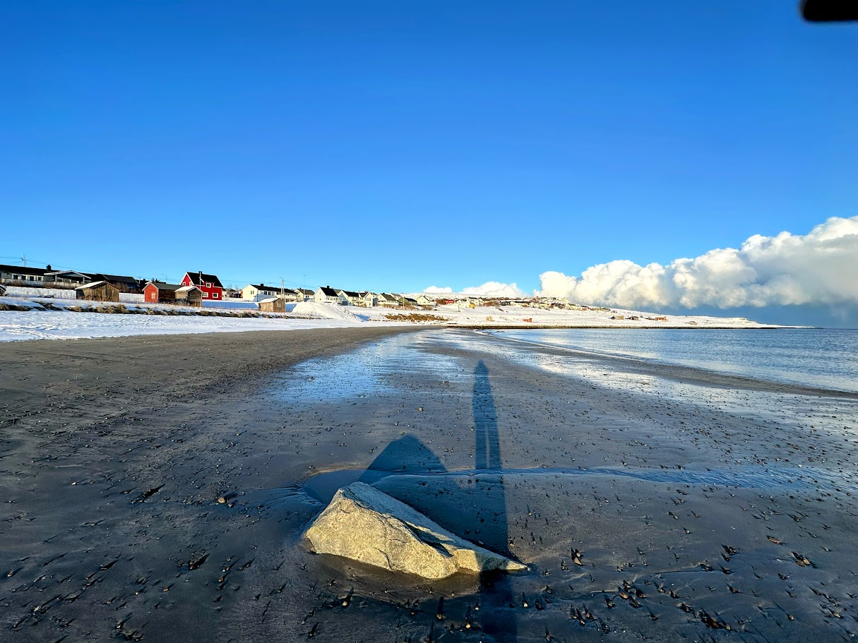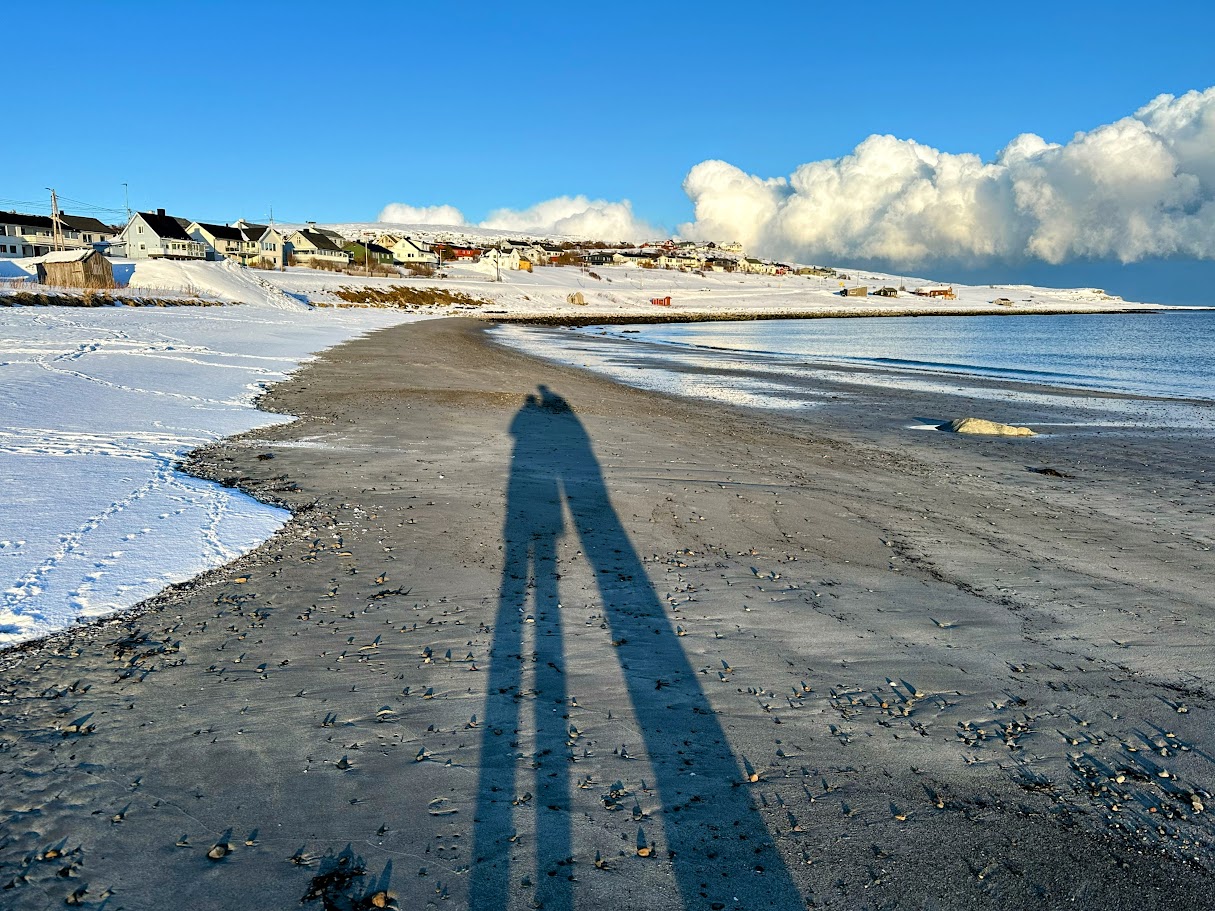 Then, there was the lovely beach – although it was freezing cold in April. That sun there is going the be the same “midnight sun” in summer – how exciting! To have the sun 24/7. The polar sun felt comforting warm, by the way. It wasn’t just “light”. Here it is: the sun, snow, sea, and sky!