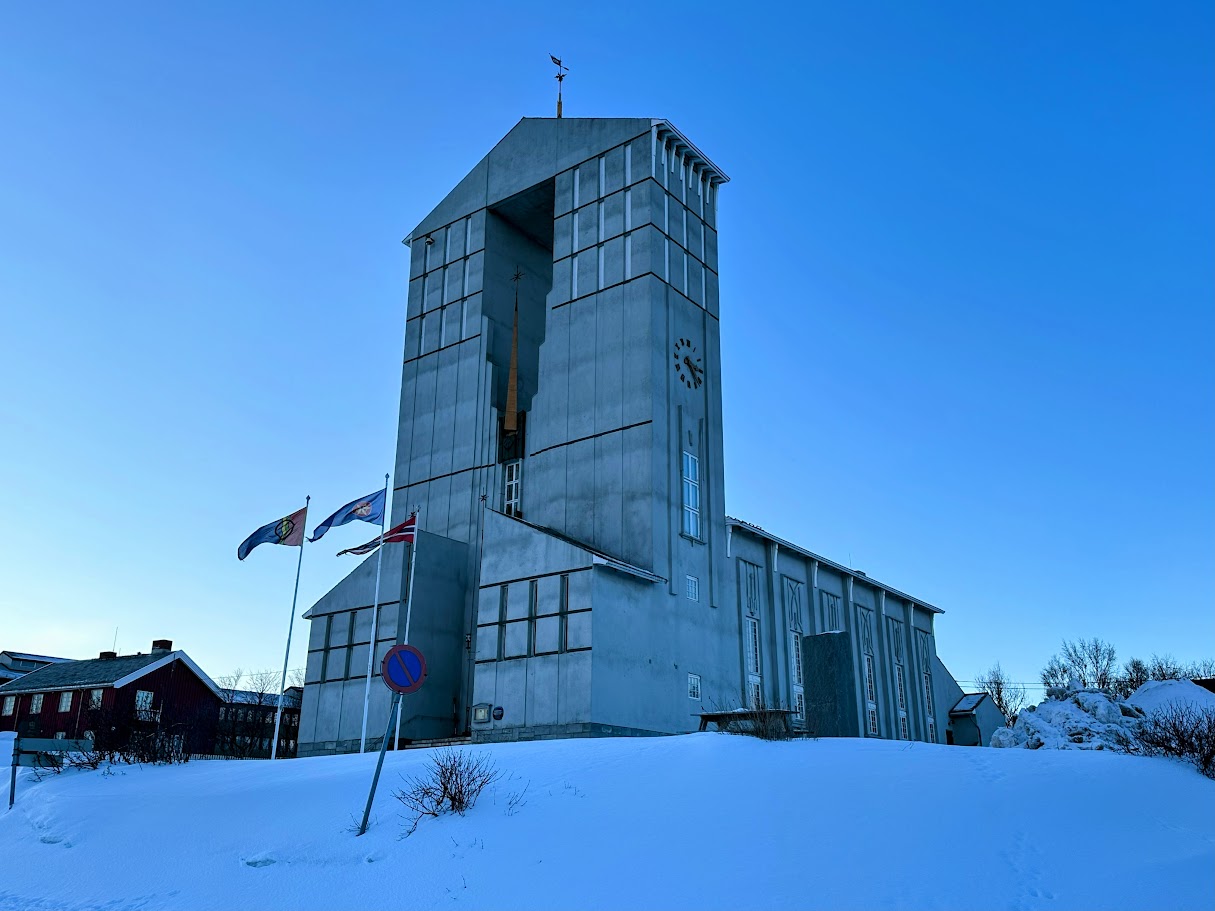 In Tana, we took a little break and bought some refreshments in a grocery store by a restaurant that was shut down (due to the coronapandemic?). Then, there was Vestre Jakobselv, with a beautiful church very noticeable from a distance. I told Carl that we should visit that on our way out the next day.